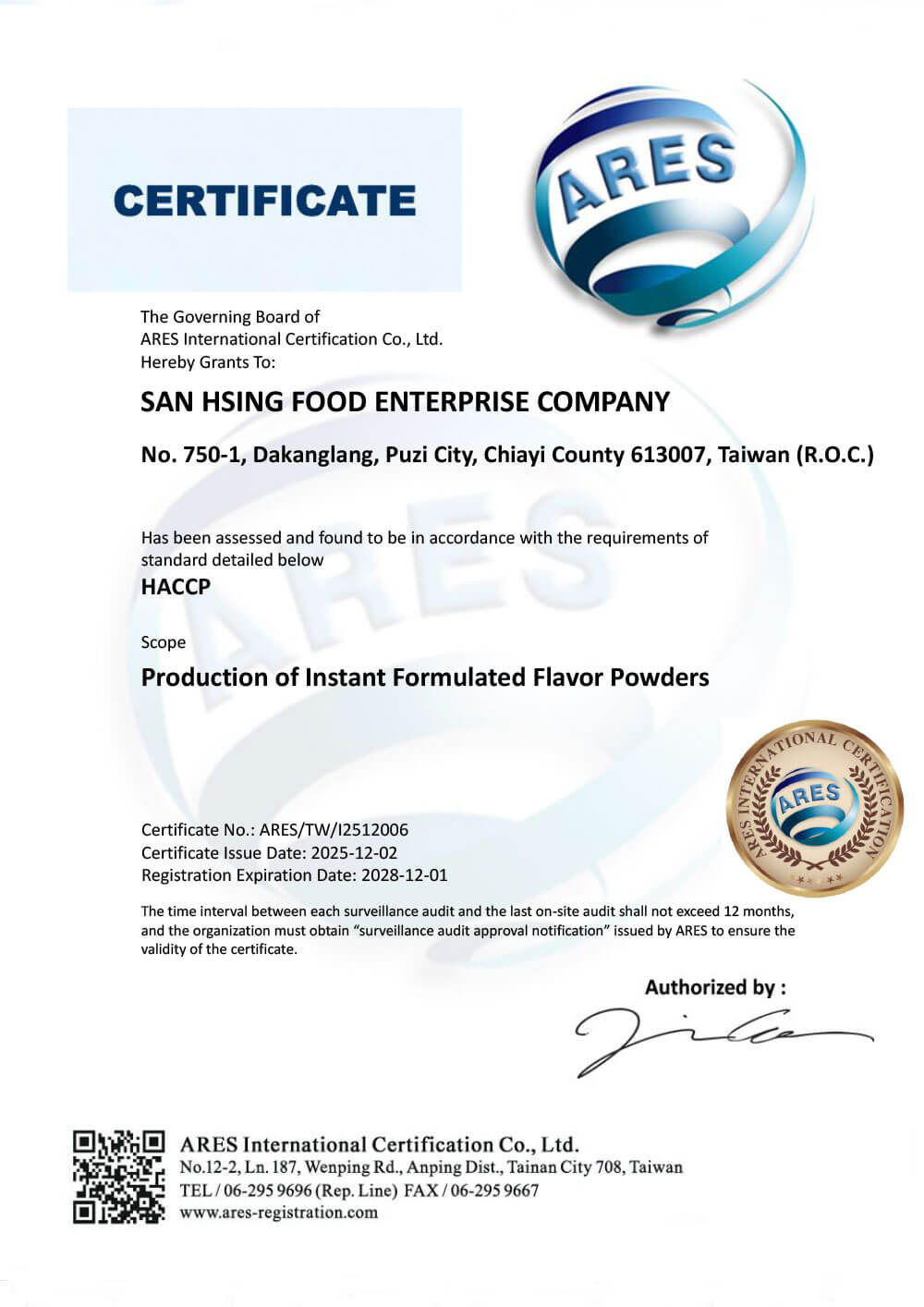 San Hsing has obtained multiple international food safety certifications, including ISO22000 and HACCP, while strictly adhering to Good Manufacturing Practices (GMP). Our production processes have been audited by the U.S. FDA and received high recognition, showcasing our expertise in food safety.