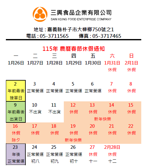 本公司將於下列期間,配合農曆節慶休假,特此告知所有客戶,協請提早備貨,如有造成不便之處,望請見諒。
